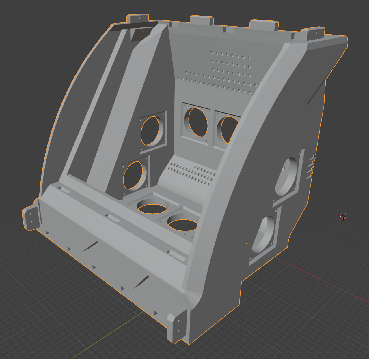 It had occurred to me that if I used a standard port for all the openings, I could easily design attachments, covers, plugs, etc. And I knew I needed to incorporate fans into the design, so I designed a "negative" model, a series of cylinders in the shape of an opening for an 80mm stock computer case fan and its screws. I arrayed copies of it on the sides/back/bottom of the model, and used the Boolean modifier to "subtract" those models from the arcade body, leaving open spaces.