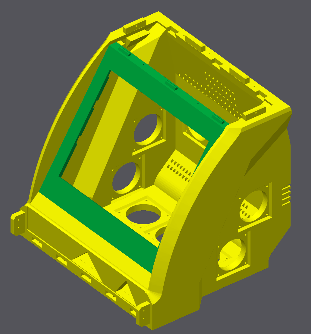 The monitor bezel design that came with the MNAC design was intended for a specific size of screen, which obviously didn't scale up properly, but the design they'd used to affix it into the cabinet was quite clever and I wanted to keep that intact. I created a replacement bezel design by exporting it into Blender, and removing the monitor aperture, leaving me with a solid flat surface. That allowed me to use a similar trick to the USB hub, where I would use a "negative" model of the monitor to carve out a space it would fit nicely into.