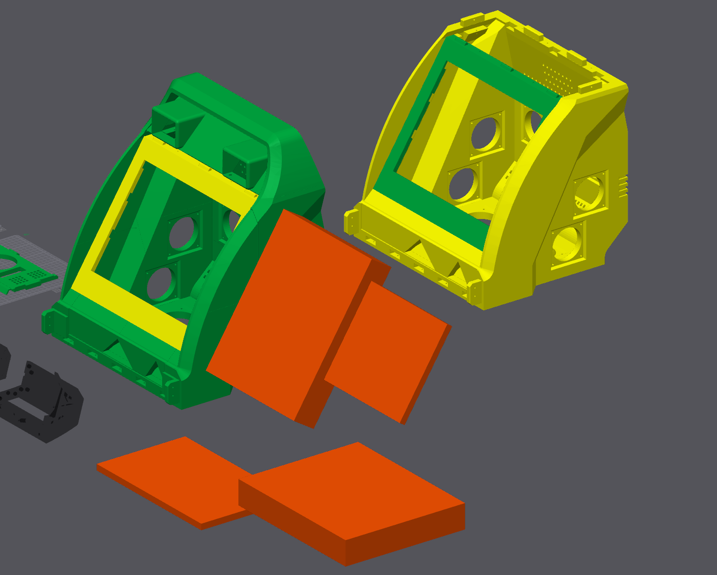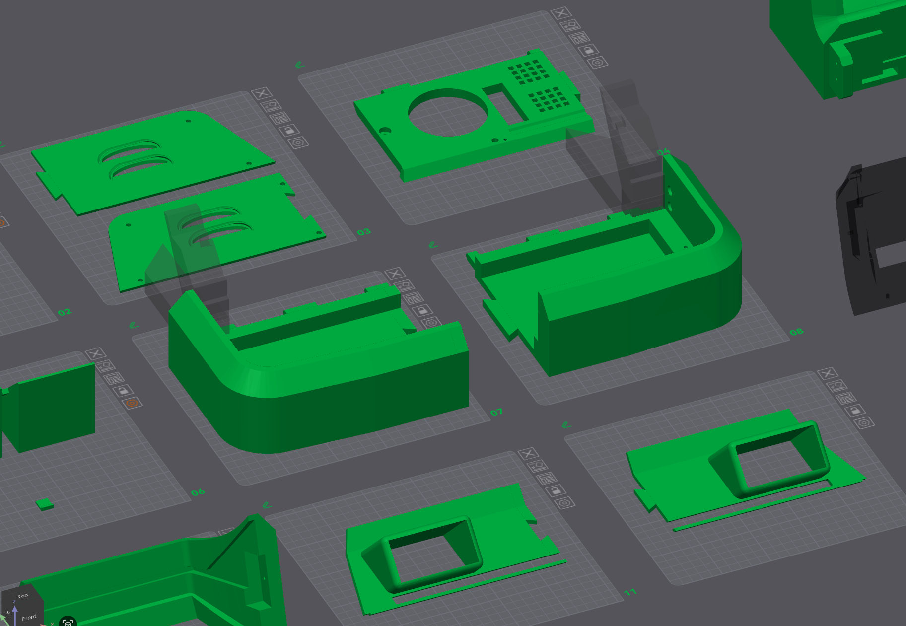 Essentially all the models had to be cut into pieces to fit on the print bed. Fortunately, most fit almost exactly as two plates, such as the controller box pictured below.