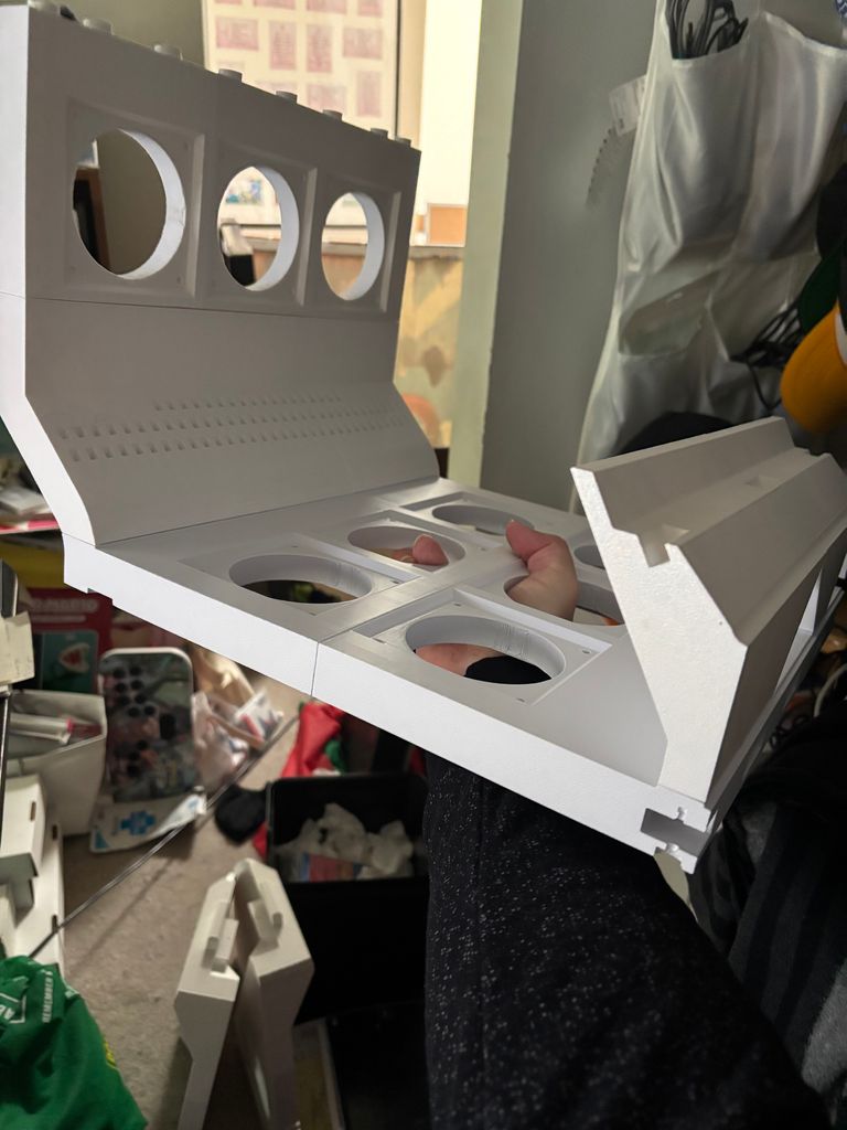 I would make similar edits and changes to the controller box and top later, once I had the main body model printed as a proof of concept. I did the same trick with Boolean modifiers, starting from a solid surface and "subtracting" the negative of a Vewlix control layout. This required some iteration as well, having to add posts to the underside of the controller box top, as the lack of supports made it worryingly flexible when buttons were pressed.