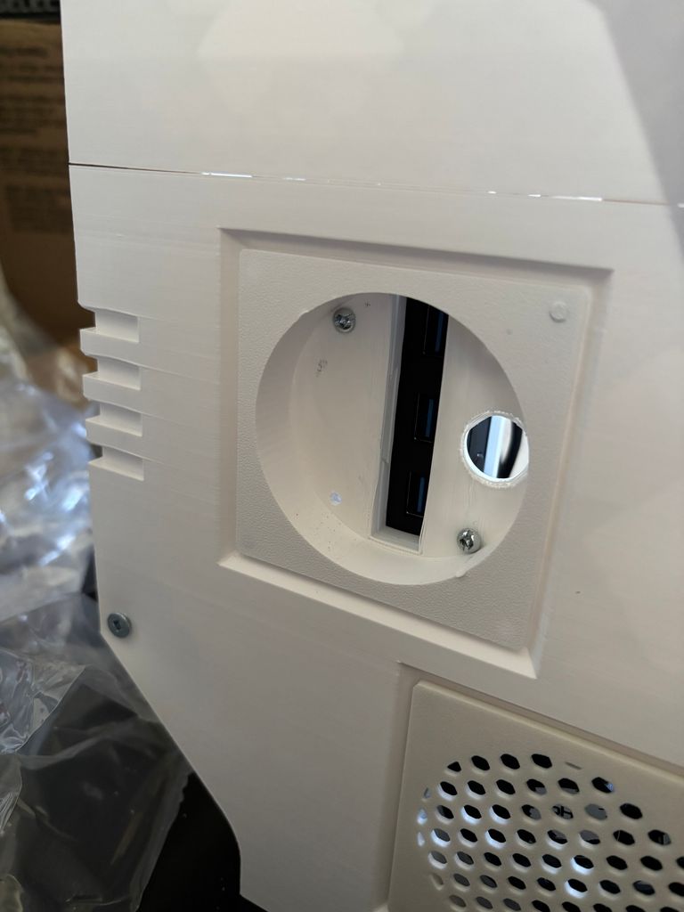 I adapted one of those indented port covers to be the mounting point for a USB hub enclosure, to be accessible from the exterior of the cabinet so people could connect additional controllers. I did this by measuring the USB hub, creating a negative volume in Bambu Studio of that size, copying that volume and scaling it up and changing it to a positive volume with a negative volume inside it. This created an enclosure that I already knew the hub would slide nearly into. I added further negative volumes to allow for ventilation and make the ports and buttons accessible from outside.