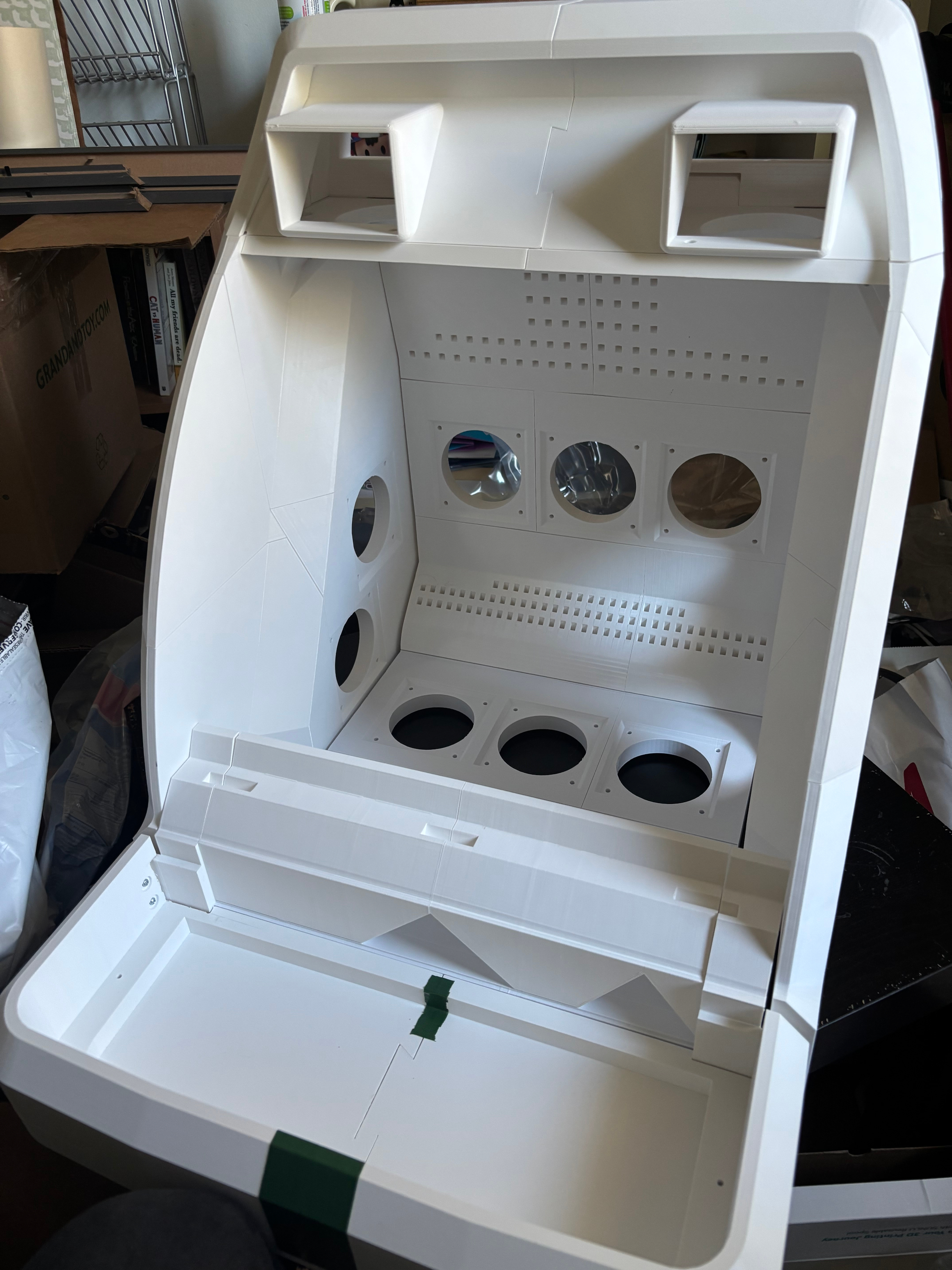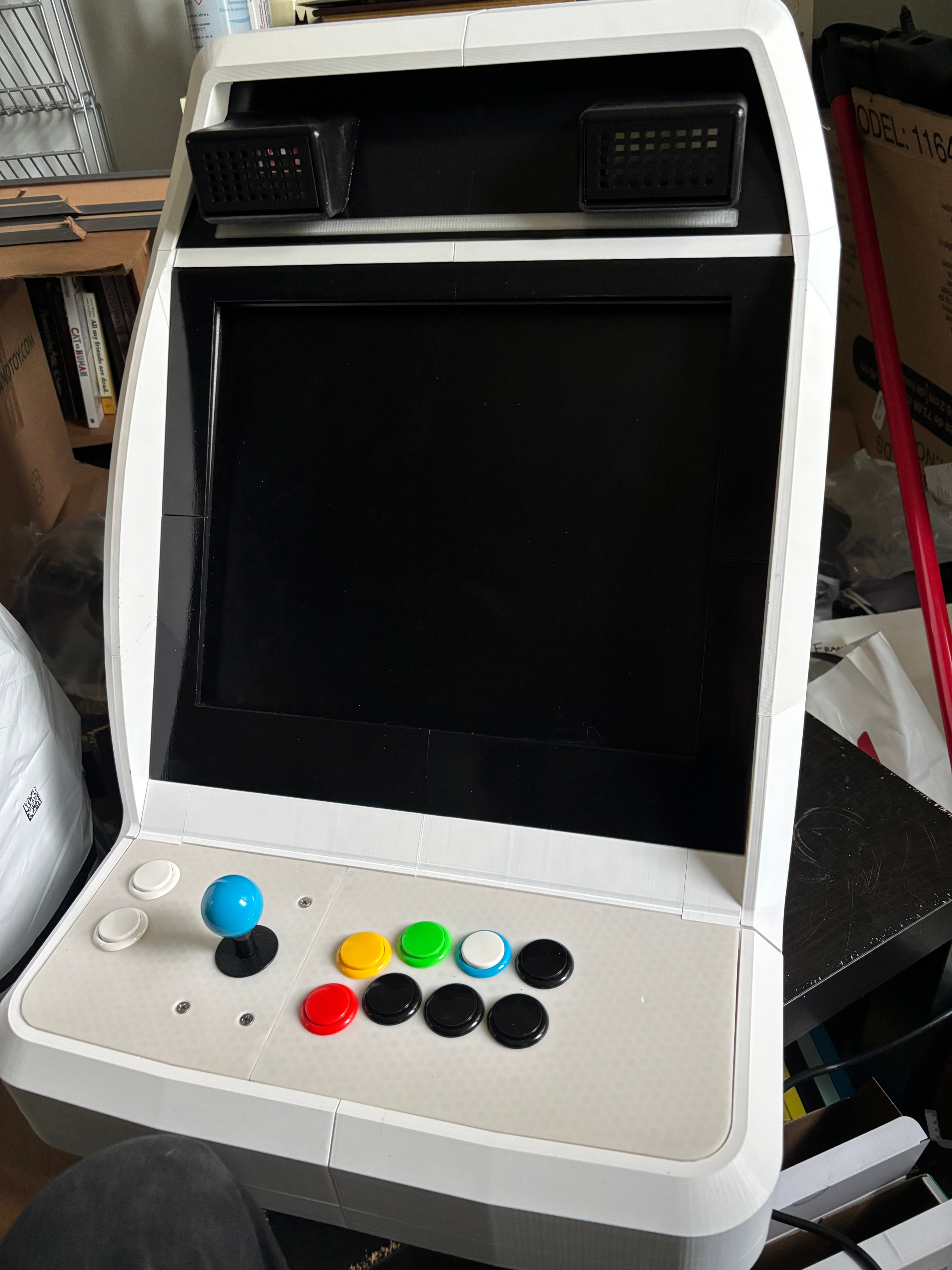 One example of a substantial edit was to export the MNAC topper speaker box as a model I could further edit in Blender, so I could shrink the speaker openings slightly and add a lightbar below them, which was an iconic feature of the original arcade cabinet missing from the MNAC design.