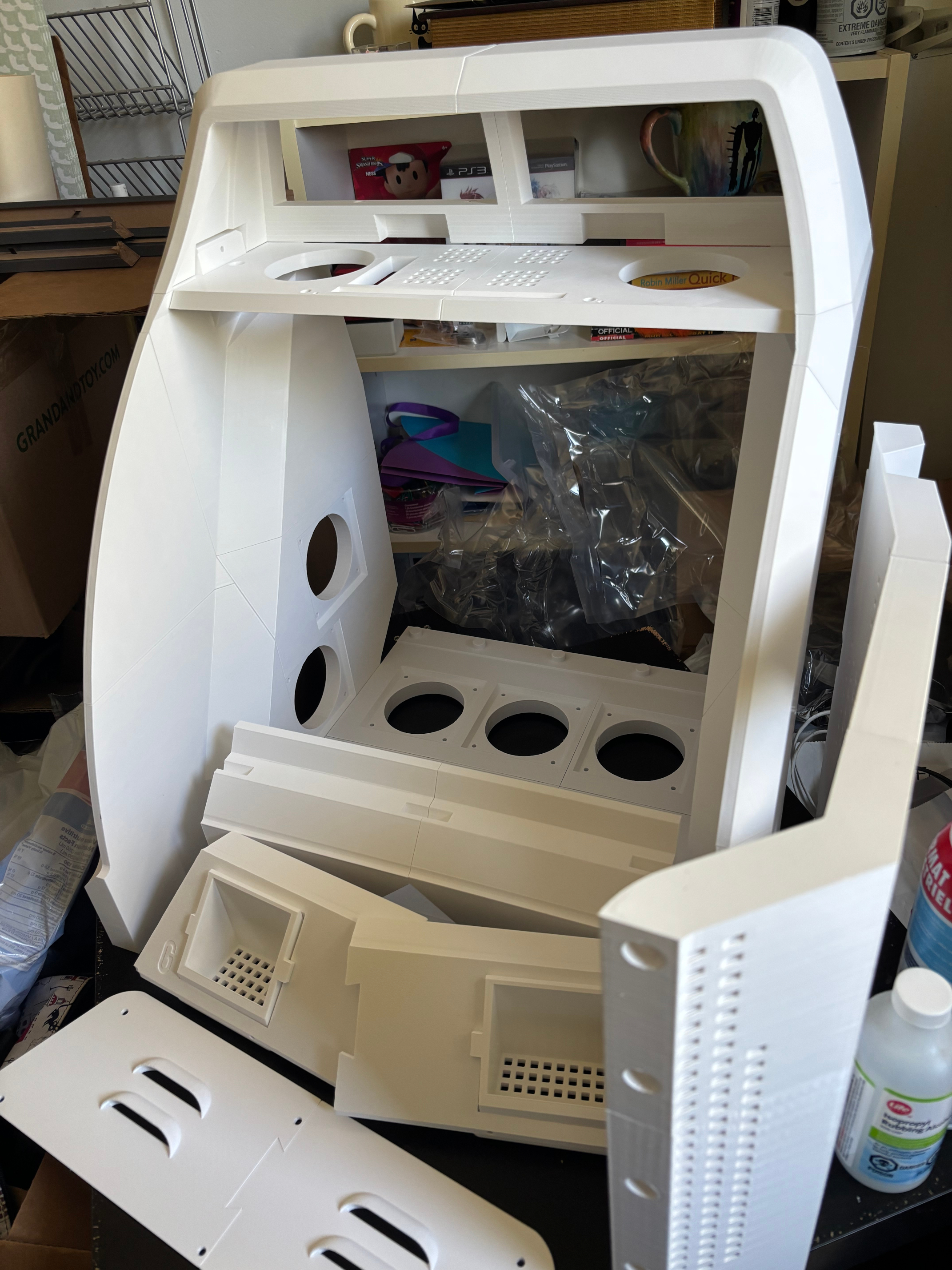 While considering how to go about printing a cabinet, I came across the excellent "Mini New Astro City" free 3D-printable model STL files made by Game-Makers. The MNAC design was very well-made, and importantly, was not pre-separated into many small parts since it was intended to be printed as larger pieces on a larger print bed (300mm³ vs my printer's 256mm³).