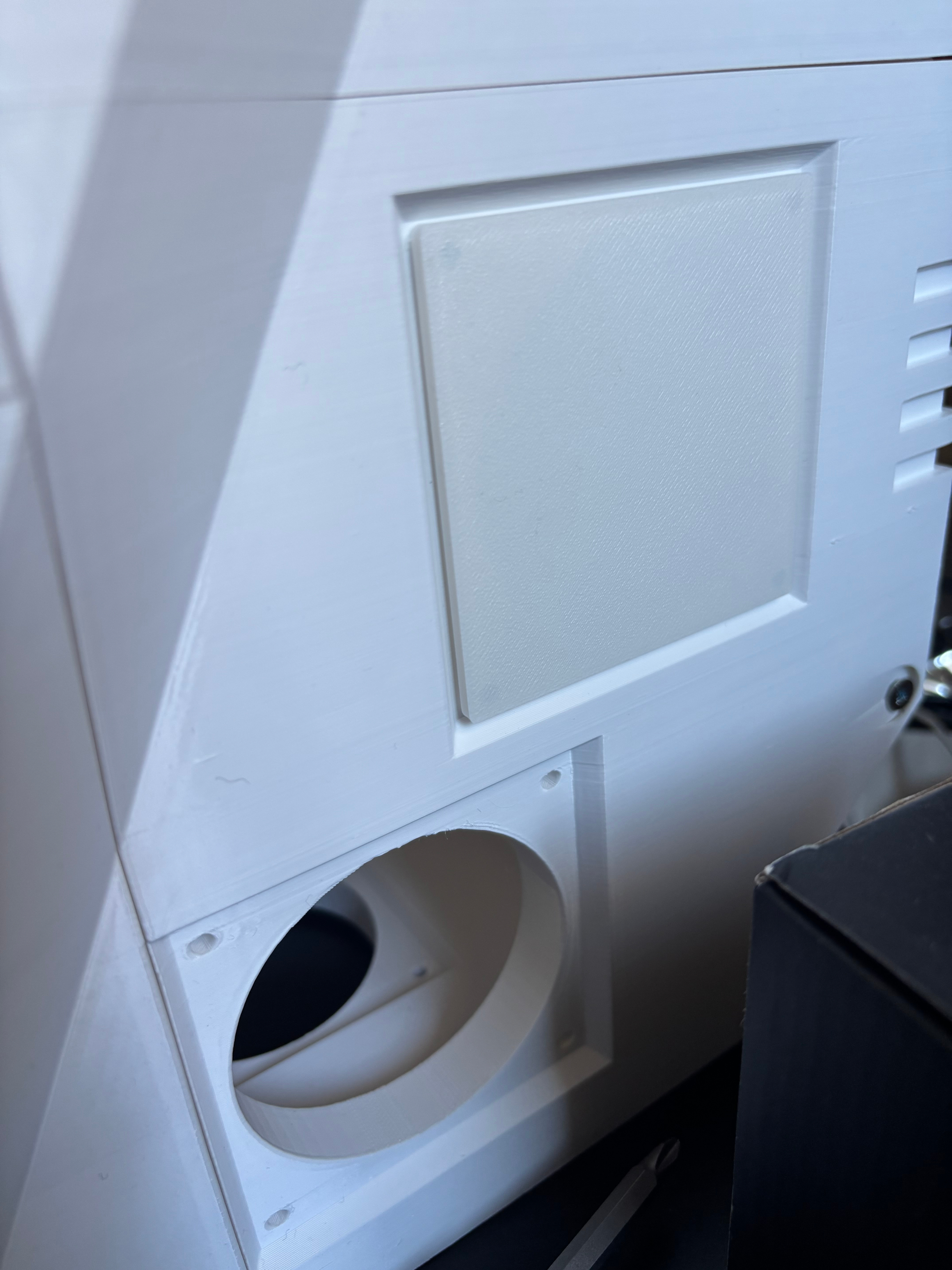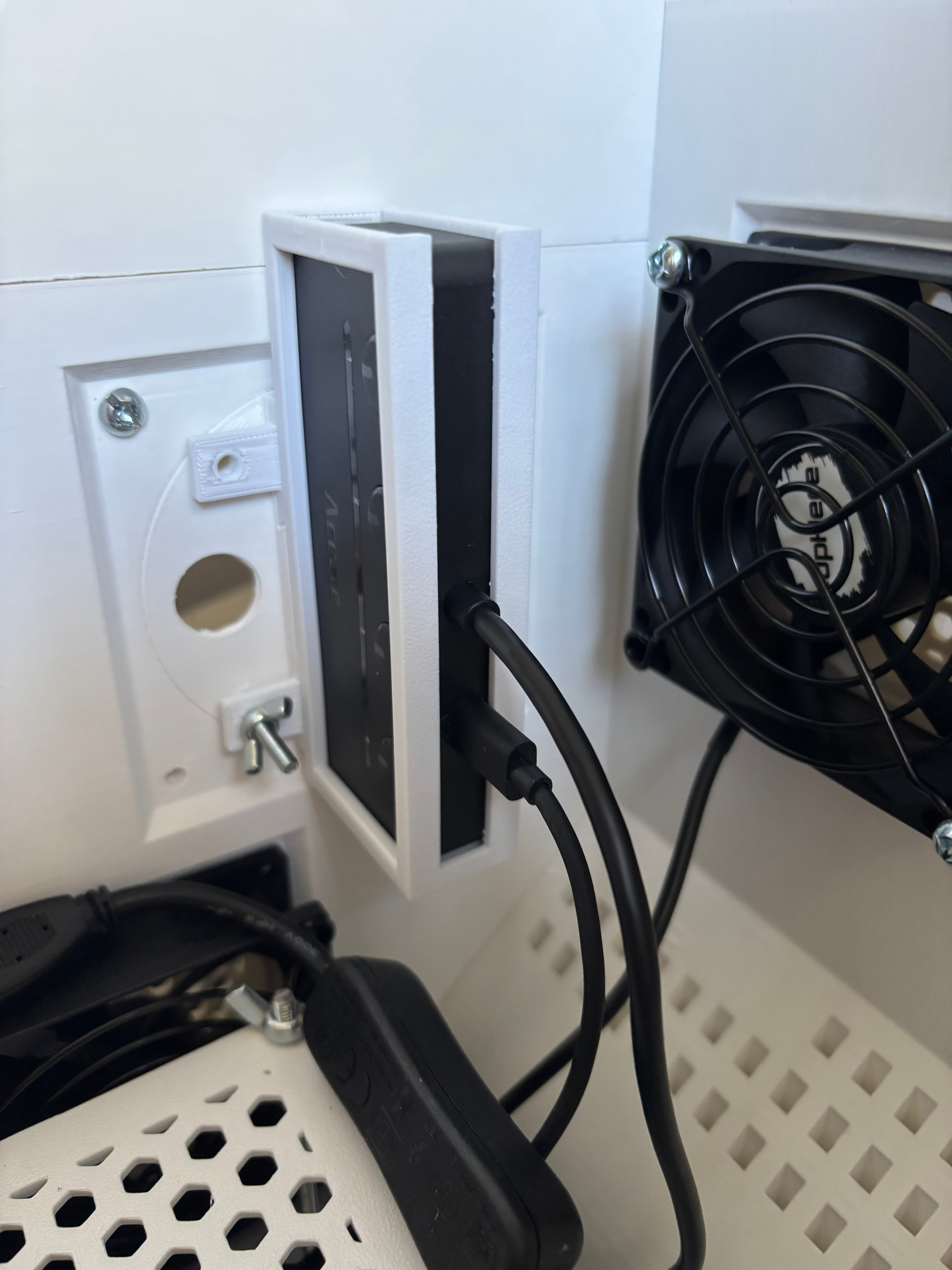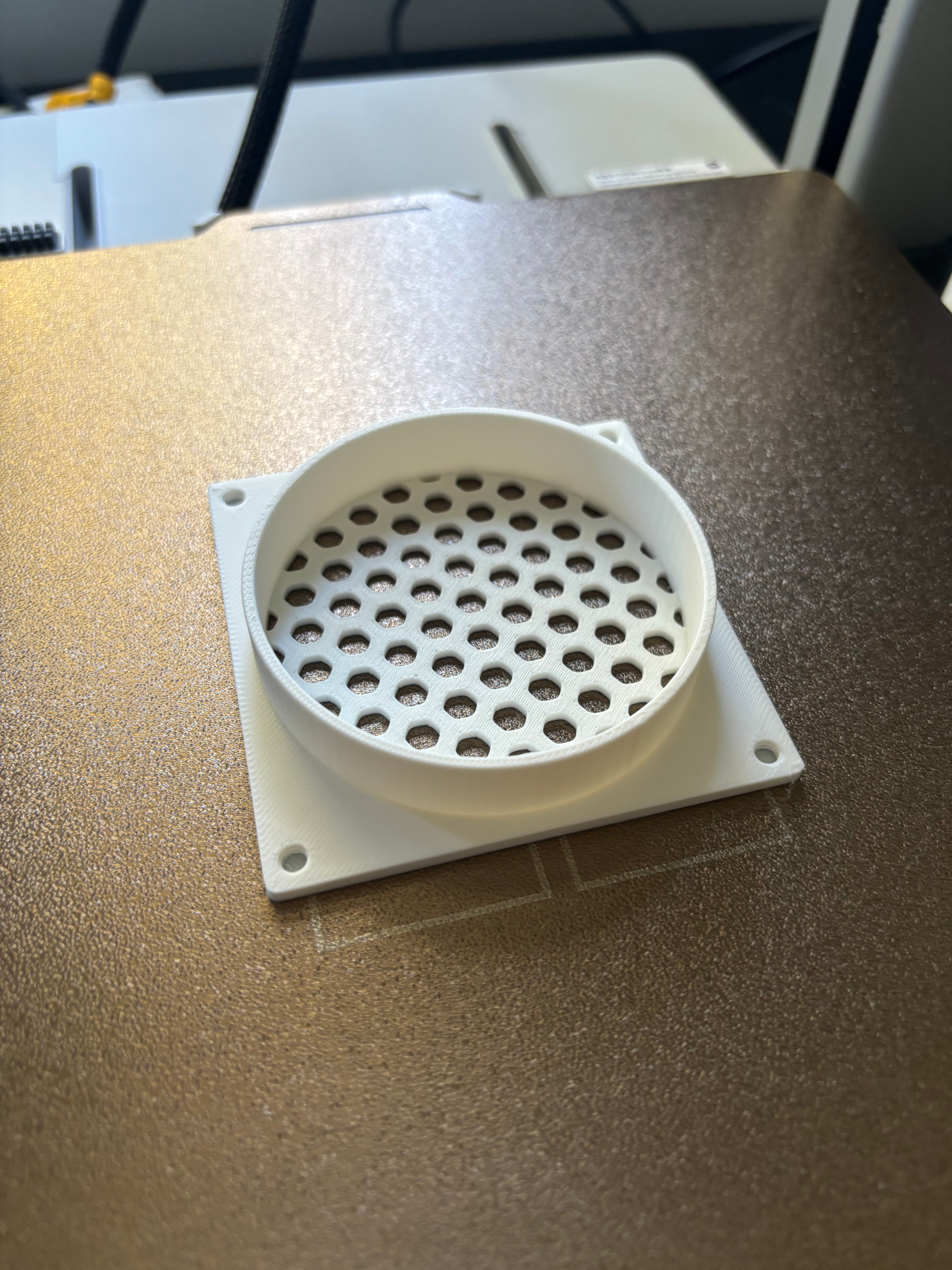 I made use of a very handy parametric grille generation tool that was created by a user of Maker World (Bambu Studio's online portal for posting printable models), to generate various fan port covers for the ports: grilles, solid covers, and indented covers for peripherals. The tool was able to add screw thread holes to the corners of the cover models, and then afterwards in Bambu Studio I added a thin solid layer at the base of those holes. This meant that the port covers could be screwed in from the inside, leaving them unable to be removed easily from the outside.