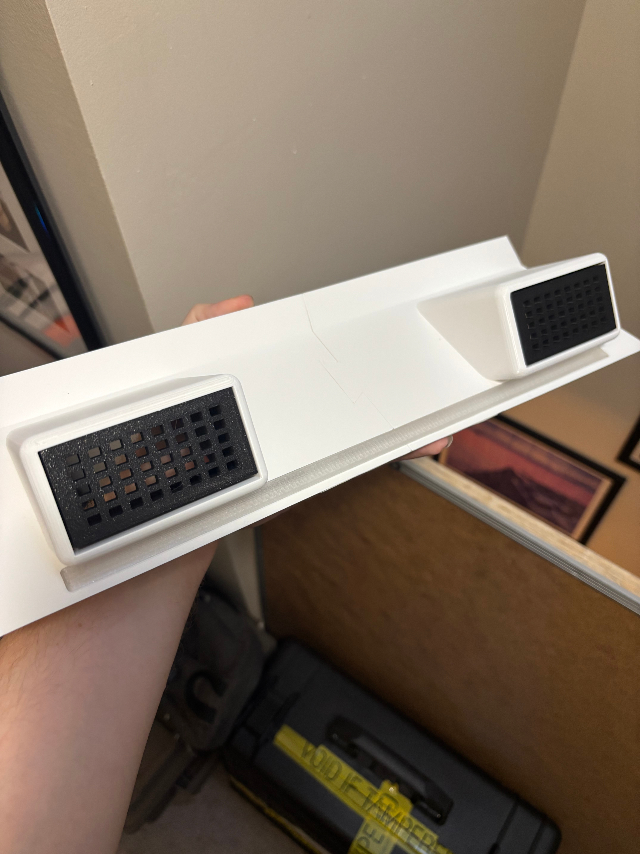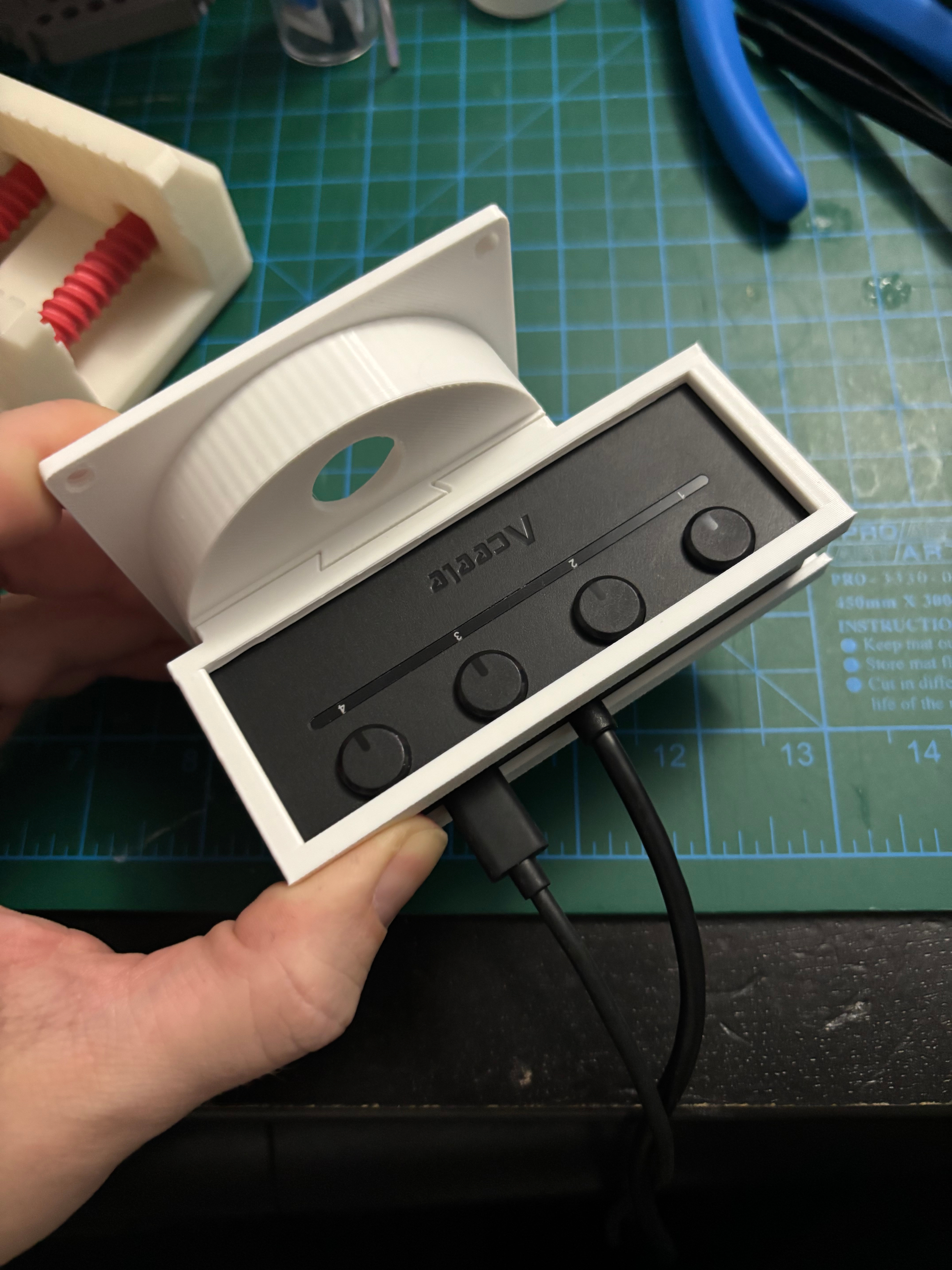 I adapted one of those indented port covers to be the mounting point for a USB hub enclosure, to be accessible from the exterior of the cabinet so people could connect additional controllers. I did this by measuring the USB hub, creating a negative volume in Bambu Studio of that size, copying that volume and scaling it up and changing it to a positive volume with a negative volume inside it. This created an enclosure that I already knew the hub would slide nearly into. I added further negative volumes to allow for ventilation and make the ports and buttons accessible from outside.