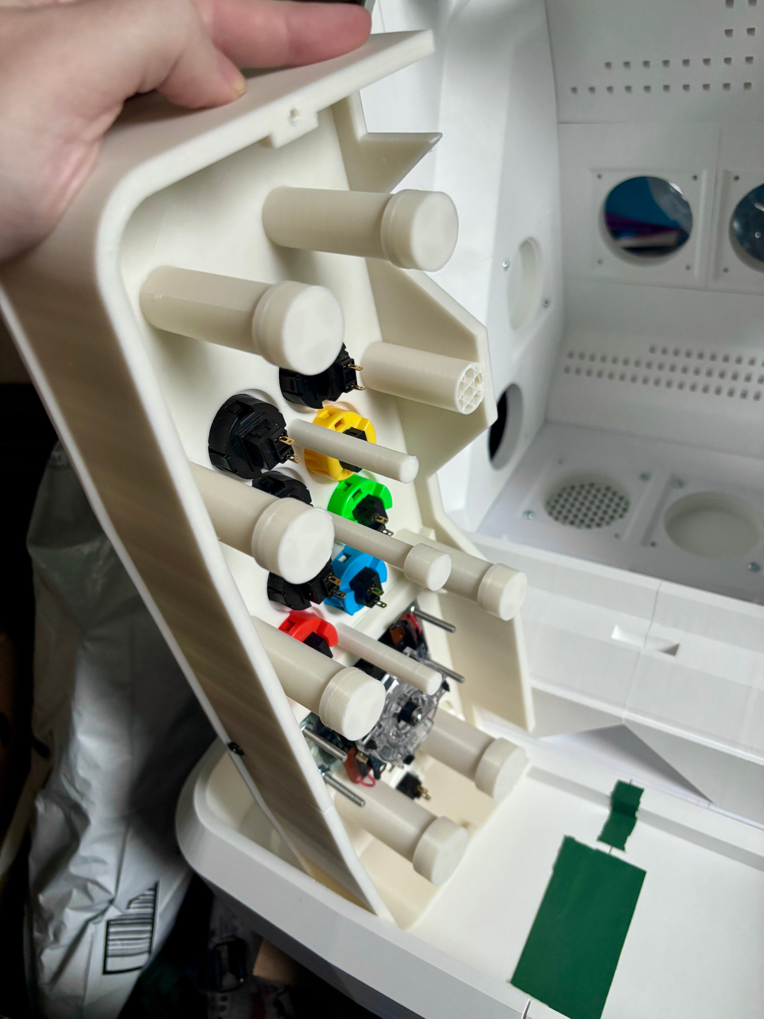 I would make similar edits and changes to the controller box and top later, once I had the main body model printed as a proof of concept. I did the same trick with Boolean modifiers, starting from a solid surface and "subtracting" the negative of a Vewlix control layout. This required some iteration as well, having to add posts to the underside of the controller box top, as the lack of supports made it worryingly flexible when buttons were pressed.